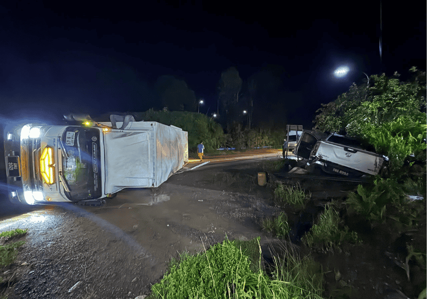 Lori Kontena Terbalik di Telupid, Himpit Kereta Penduduk Kampung