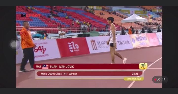 THAILAND: 23 Januari 2026 — Atlet para olahraga Sabah, Ivan Jovic Suan, berjaya membawa pulang pingat emas dalam acara 200 meter lelaki T44 pada Sukan Para ASEAN (APG) Thailand 2025 dengan catatan masa 24.25 saat, sekali gus mencatat masa cemerlang untuk pasukan Malaysia di temasya itu.