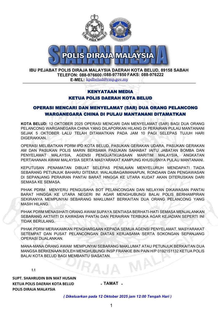 KOTA BELUD: 12 Oktober 2025 – Operasi mencari dan menyelamat (SAR) dua pelancong warga China yang dilaporkan hilang di perairan Pulau Mantanani sejak 5 Oktober lalu ditamatkan hari ini selepas tujuh hari dijalankan.